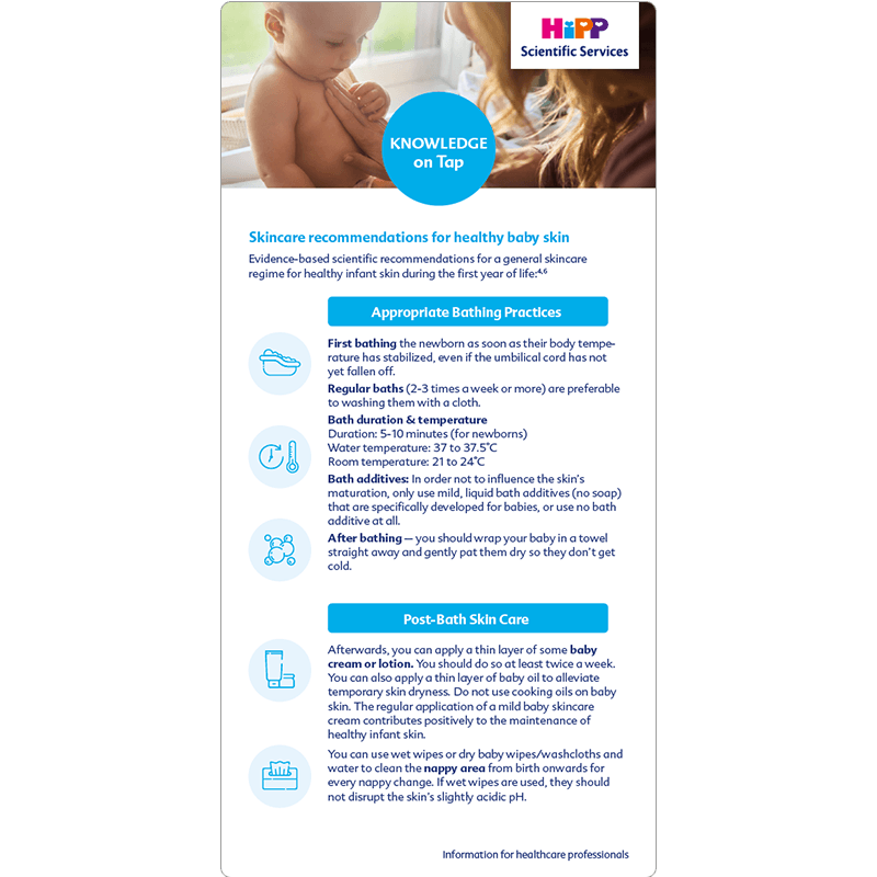 In infants, the skin surface area in relation to body weight is twice as large and five times thinner than that of adult skin. As a result, babies can lose fluids more quickly and are more prone to cooling down. Temperature and moisture regulation are limited because the sebaceous and sweat glands are not yet fully functional and the level of natural moisturizing factors (NMFs) is lower than in adult skin. Because the infant skin is more permeable and the protective acid mantle is not yet fully developed, it reacts much more sensitively to external influences than adult skin. Clear recommendations help to facilitate baby care. There are numerous recommendations regarding babys skincare. Several years ago, a European expert panel developed evidence-based guidelines for general baby care from birth until the end of the first year of life. In recent years, these recommendations have been expanded and confirmed by experts. They apply to the care of healthy baby skin; in cases of skin conditions, a different approach may be required.