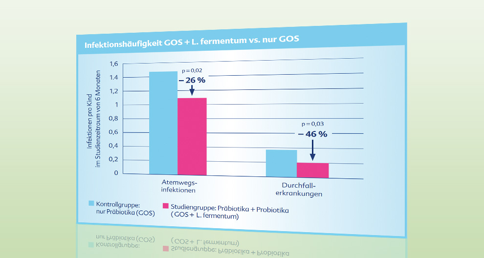 The two studies investigated the safety and effects of infant formula with pre- and probiotics. The combined administration of natural lactic acid culture and GOS proved safe and well-tolerated, additionally the incidence of gastrointestinal infections was clearly lowered.